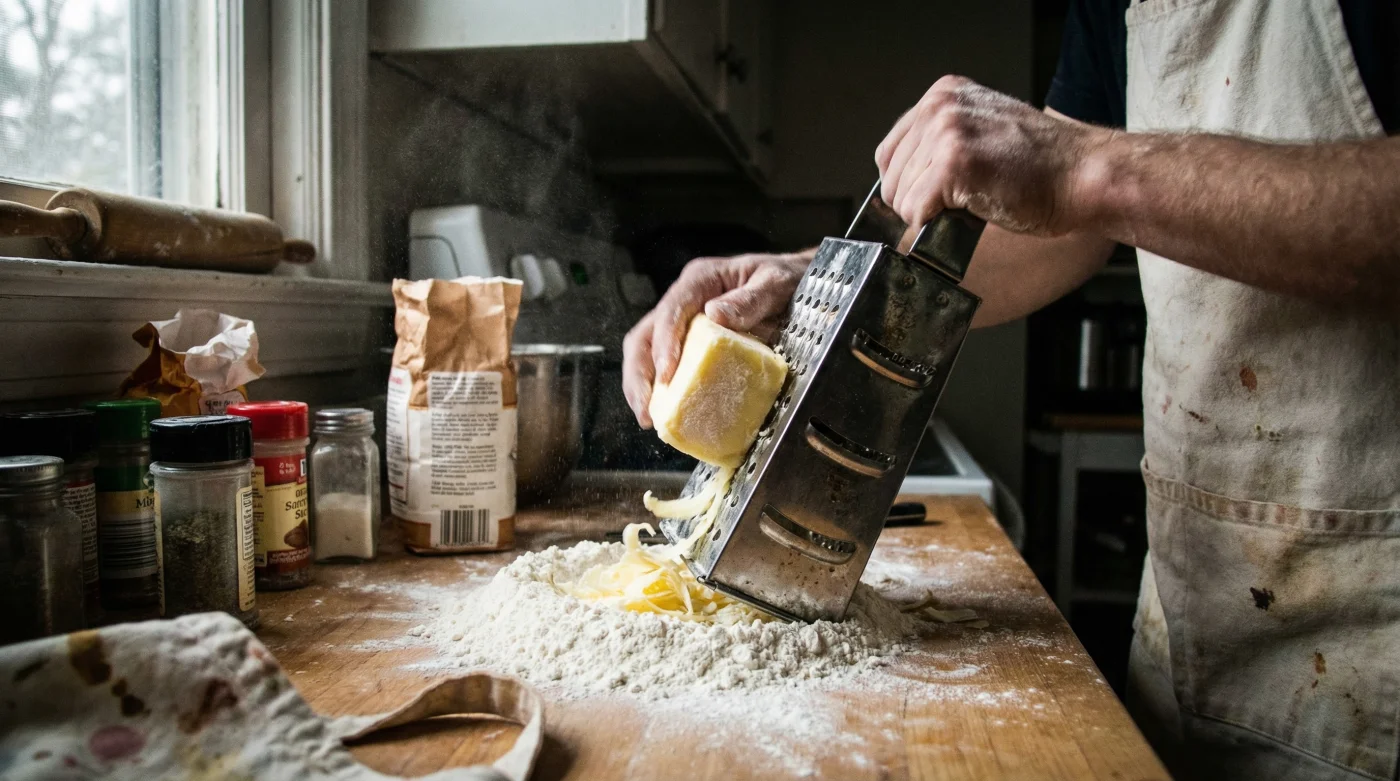 • Adım 2: Hızlı Rendeleme: 300 gram un için tam 150 gram dondurulmuş Tereyağı ölçün. Rendenin en iri delikli kısmını kullanarak, yağı doğrudan soğuk unun üzerine hızla rendeleyin.